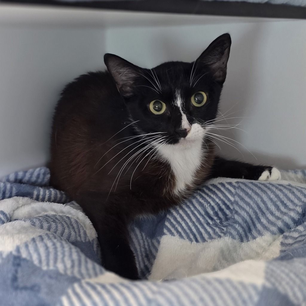 Liquorice is a beautiful 1-year-old female Domestic Short Hair with a sleek black coat and a touch of white. She’s a young girl with a gentle presence and a quiet charm.