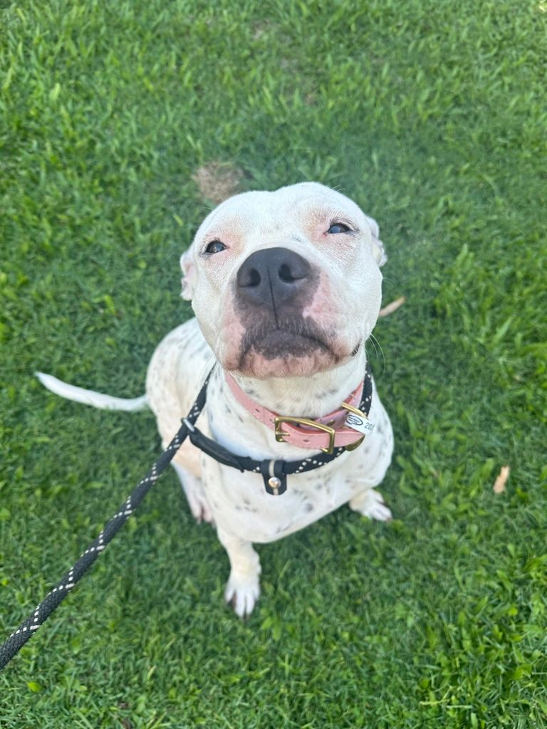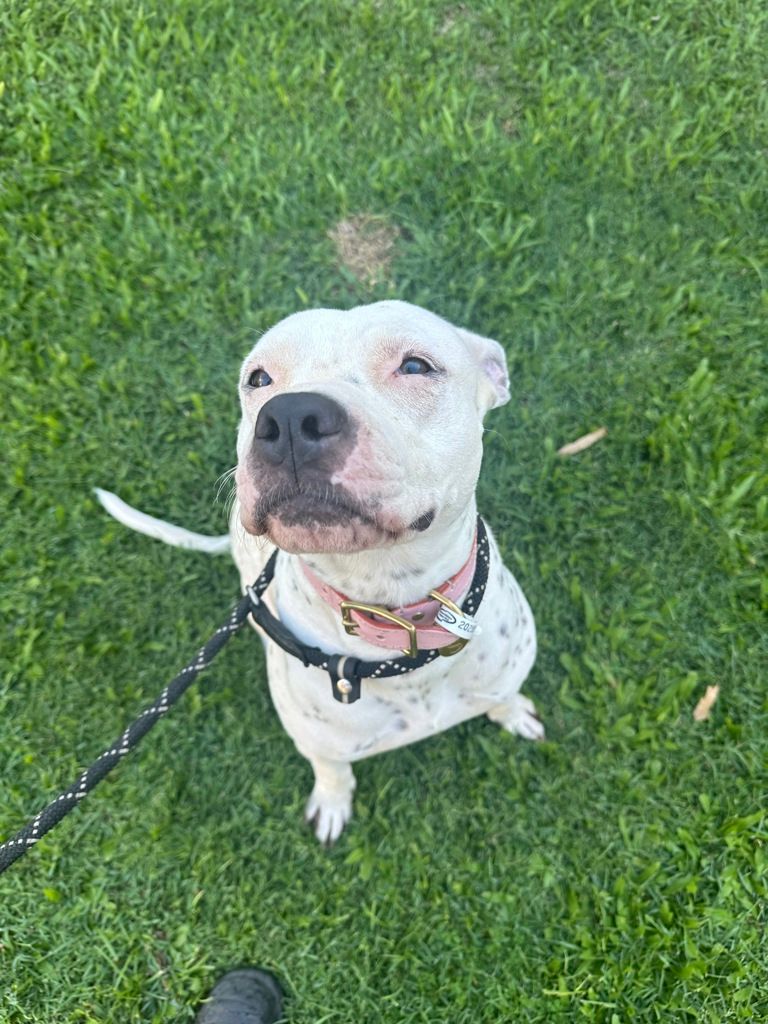 Hi, I’m Cleo, a sweet and spotty white Staffy girl with a gentle heart and a shy little soul. I can be a bit slow to warm up, but once I feel safe, my soft and affectionate nature really shines through. I’m the kind of dog who blossoms with patience, kindness, and someone who understands that trust is built little by little. β¨