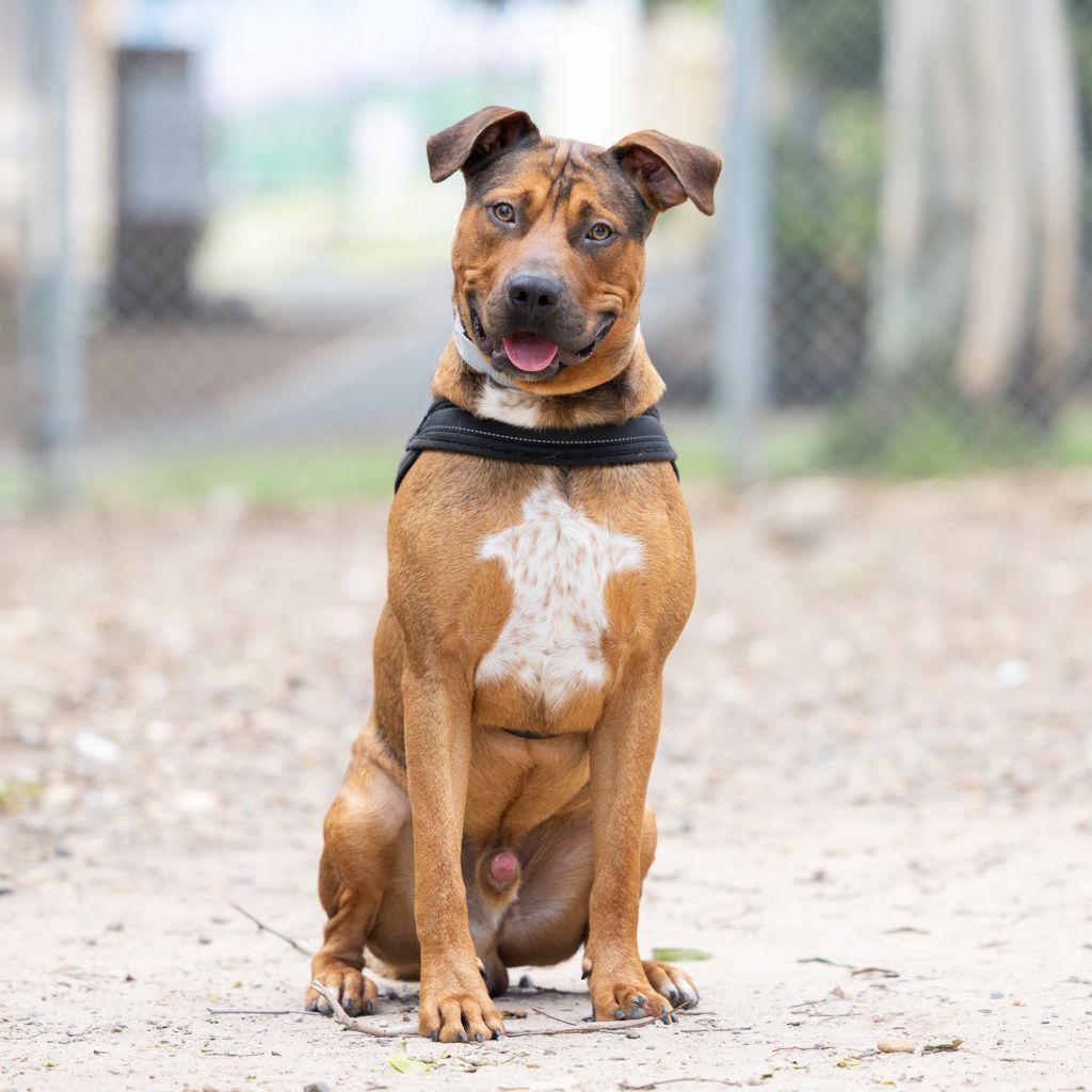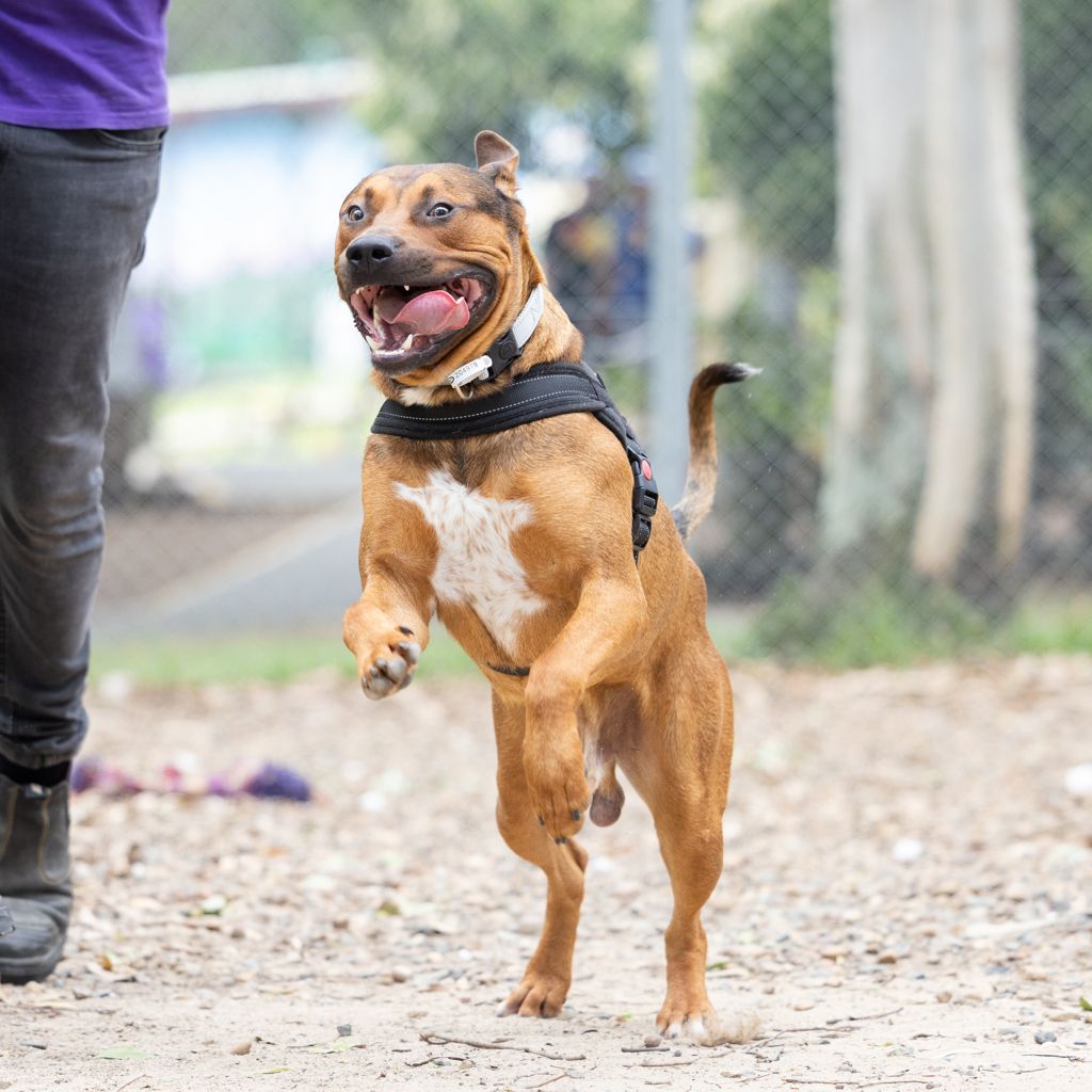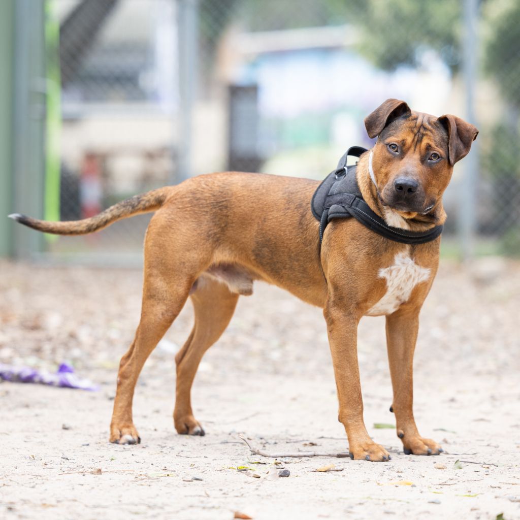Bubby is a young American Staffy cross who is a big-hearted, boisterous bundle of joy! He adores everyone he meets and brings boundless energy and excitement wherever he goes. Playful and rambunctious, Bubby is still learning his manners and discovering that not everyone enjoys his energetic, rough-and-tumble style of play.