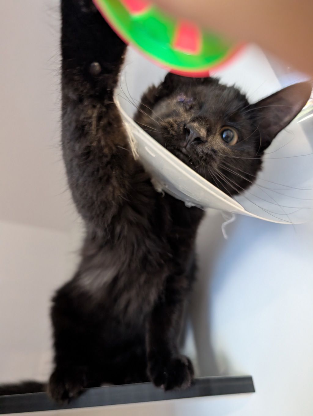 This adorable little black kitten may be small, but she has a big personality and an even bigger heart. Elphaba is around 3 months old and is bonded with her sister, Nessa – the two are inseparable and will be looking for their forever home together.