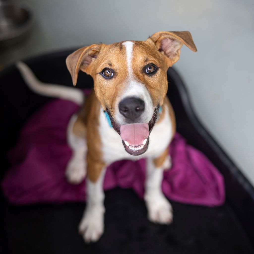 He can also be a bit unsure around new dogs, but he’s curious and has shown his playful side with his sibling. With some time, patience, and confidence-building, Waffle is ready to really come out of his shell and show his fun-loving personality.